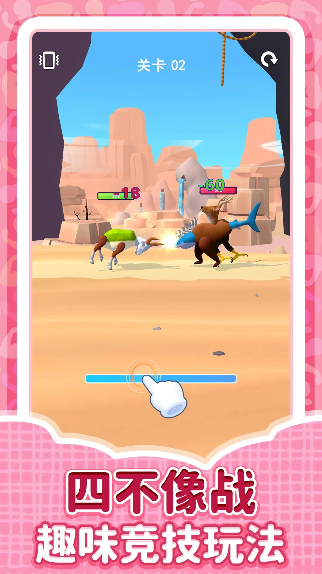 进入关卡先选动物身体,再选四肢、头部等组成新动物对决。战斗中用手指在屏幕滑动前进攻击或后退防守,击败对手闯关后能解锁更多动物肢体,组装新动物继续战斗。掌握这些攻略,能让你在游戏中轻松上手,享受更多乐趣。