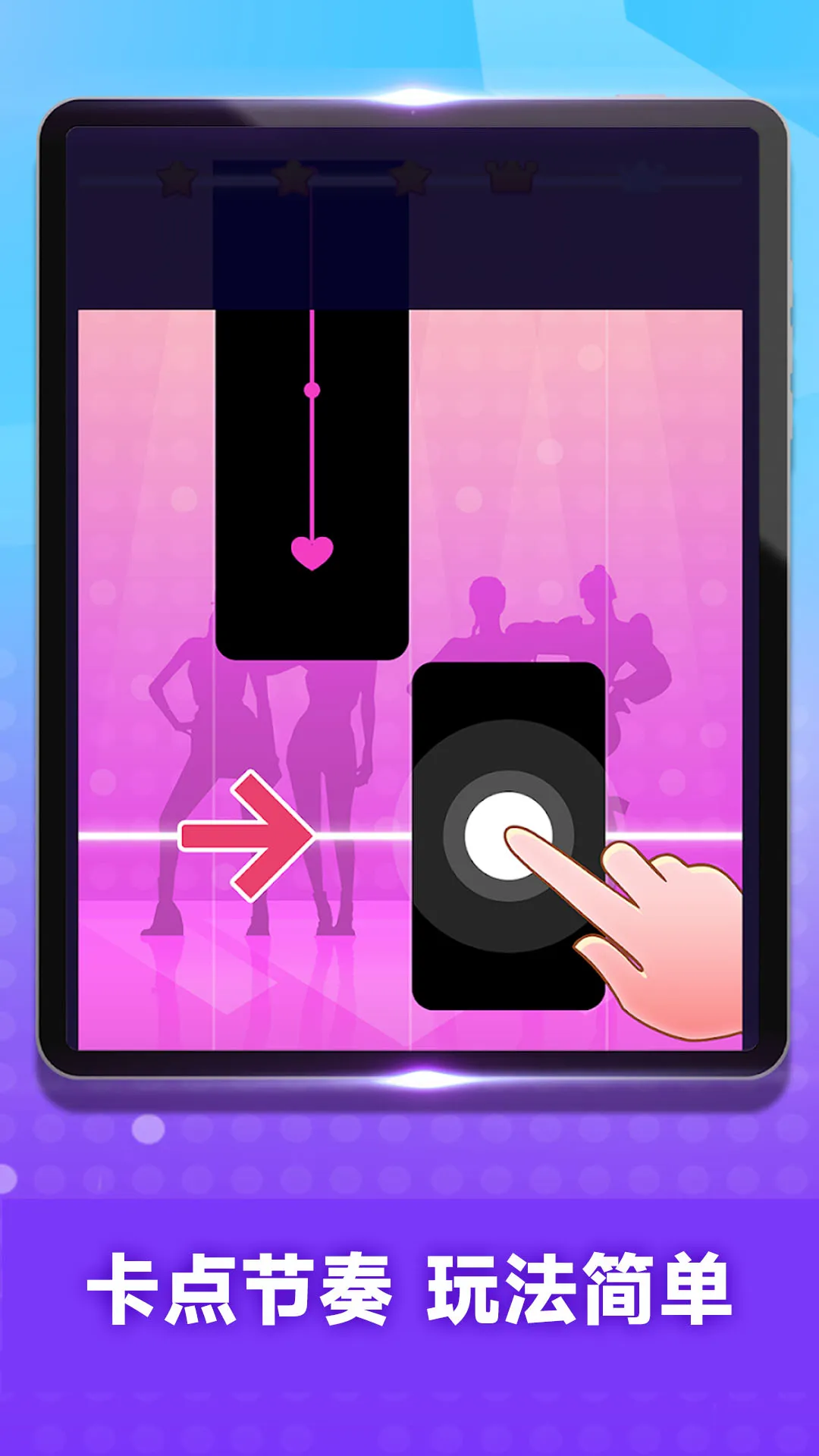 游戏特色丰富,每日签到有好礼,连续登录奖励更丰厚,还会持续更新热门新歌。其亮点也十分突出,精美的3D画面搭配流畅特效,点击音符带来视听双重享受;操作简单易上手,新手能快速融入;有全球性积分排行榜,可开启竞技模式争夺王者宝座;支持离线畅玩,不受网络限制。这款游戏既挑战手速,又考验节奏感与音乐掌控力,值得一玩。