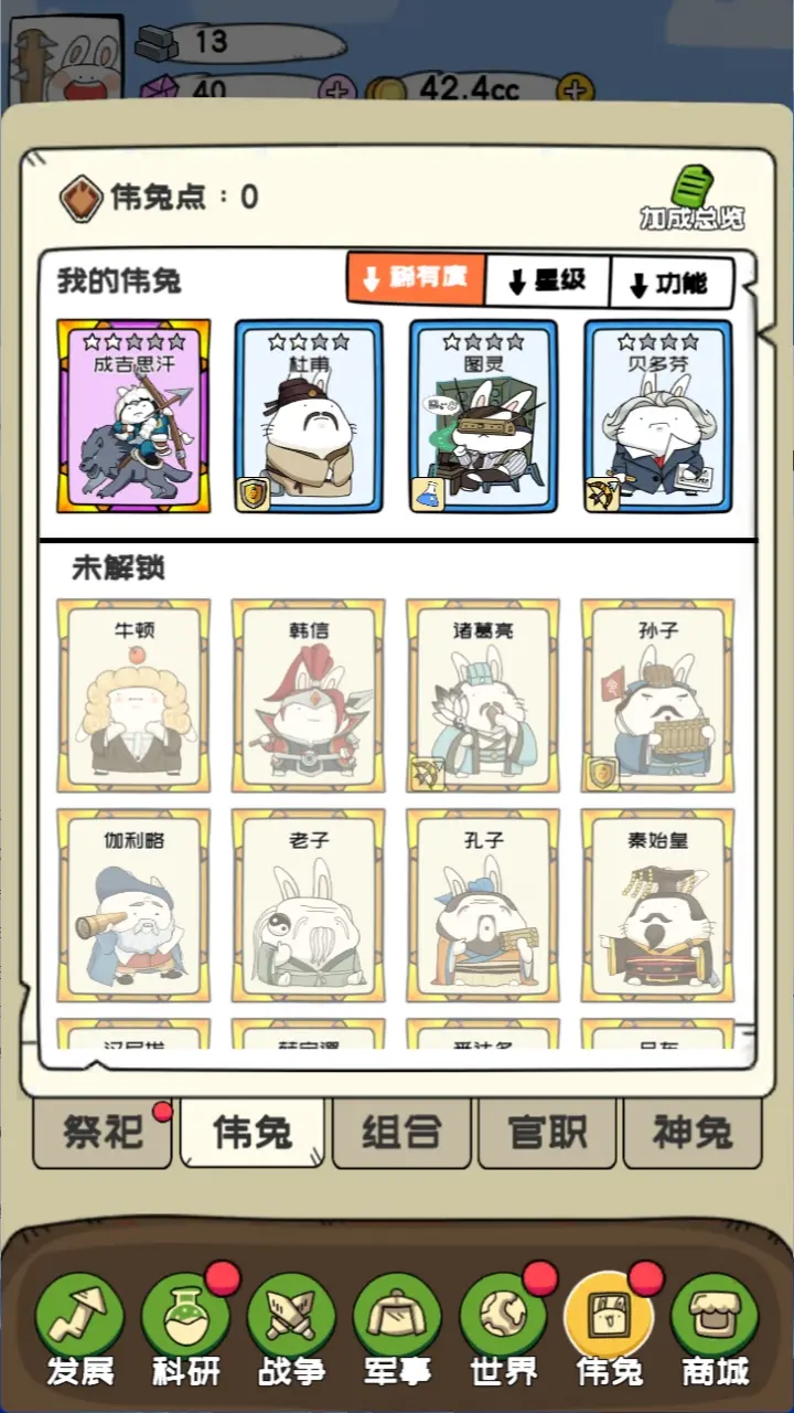 1、丰富的玩法融合:游戏融合了放置经营、策略、养成等多种元素,玩家既需要合理分配资源,升级产业推动文明发展,又要搭配战斗阵容应对挑战,还能通过喂食互动与萌兔建立感情,玩法丰富多样。