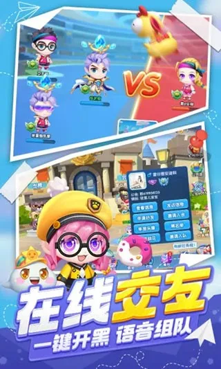 3、画面风格亮眼:整体画面以Q版风格呈现,有端游级精致3D人物模型以及激萌动作互动,还包含炫酷的战斗特效,营造出热血激烈的游戏氛围。